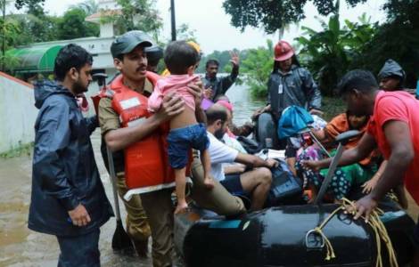 Kochi (Fides) – „Tausende von Menschen sind weiterhin in verschiedenen Teilen von Kerala in Indien betroffen, wo es seit Tage ohne Unterbrechung regnet, was zu den schlimmste Überschwemmung seit fast hundert Jahren führte. Die Rettungsaktionen laufen noch, doch oft sind die Helfer kaum in der Lage, Tausende von Menschen zu erreichen, die auf den Dächern von Häusern und Gebäuden auf Rettung warten. In 13 von 14 Bezirken gilt die höchste Alarmstufe. Die Zahl der Obdachlosen ist auf etwa 370.000 angestiegen. Die Schulen in allen 14 Distrikten in Kerala mussten geschlossen werden", so der indische Redemptoristenpater Biju Madathikunnelm der über die aktuelle Lage und die Hilfsmaßnahmen der katholischen Kirche in Kerala berichtet.