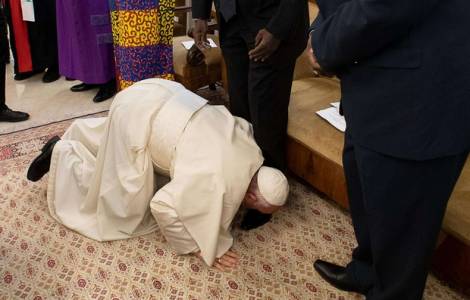 Am gestrigen 11. April hatte sich Papst Franziskus beim Abschluss der spirituellen Exerzitien der politischen Führer des Südsudan (vgl. Fides 9/4/2019) in der „Domus Sanctae Marthae“ im Vatikan, kniete Papst Franziskus vor den südsudaneischen Verantwortungsträger niedergekniet und um Engegement für die Zukunft des neuen Staates gebeten, der am 12. Mai gegründet werden soll, und dabe die Füße des Präsidenten der Republik, Salva Kiir Mayardit, sowie der designierten Vizepräsidenten, darunter Riek Machar und Rebecca Nyandeng De Mabior die Füße geküsst.