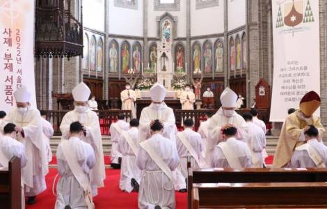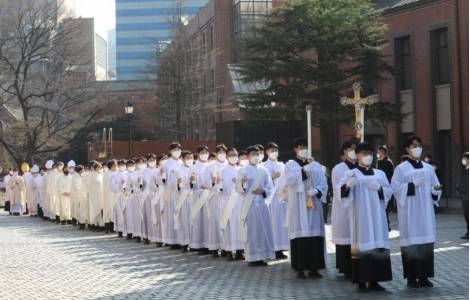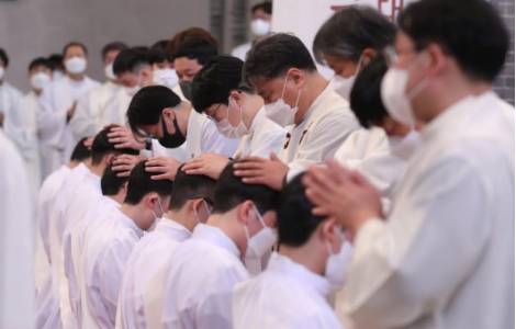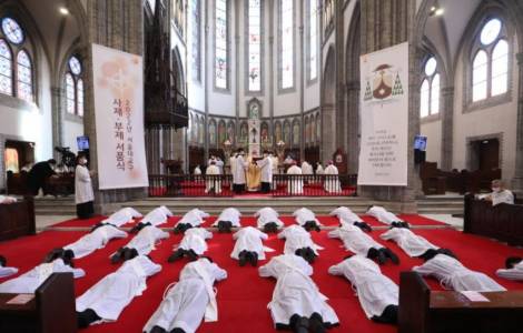 Seoul (Agenzia Fides) - The Catholic Church of the Archdiocese of Seoul has welcomed 23 new priests who will dedicate themselves to pastoral service and evangelization. The solemn Eucharistic Celebration with the Sacrament of Holy Orders was presided over today, January 28, at the Myeongdong Cathedral, by the Archbishop of Seoul, Msgr. Peter Chung. According to information from the Office of Communications of the Archdiocese, the ceremony was held in compliance with anti-Covid guidelines. Due to restrictions, only the parents of the new priests were able to attend. The liturgy was broadcast live on the television channel of the Catholic Peace Broadcasting Corporation and its YouTube channel. Monsignor Chung thanked God for the gift of these "new workers for the harvest", extending his gratitude to the parents of the newly ordained priests, to the parish priests and nuns, to the teachers and spiritual guides, and to the benefactors, who accompanied and supported the new priests in their vocation and in their path of formation.