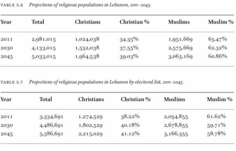 Los datos se basan en cifras según las cuales la población libanesa en 2011 había llegado a 3.334.691 habitantes, con un 38,22% de cristianos y un 61,62% de musulmanes. Se espera que en 2030 la población libanesa pueda superar los 4.486.000, con un 40,18% de cristianos y un 59,71% de musulmanes. En el año 2045, se estima que la población libanesa podría superar los 5.386.000 habitantes, con un 41.12% de cristianos y 58.87% de musulmanes.