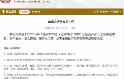 Pékin (Agence Fides) – « Le Pape François est retourné à la Maison du Père le 21 avril 2025 à 7h35, dans la Résidence Sainte-Marthe, à l'âge de 88 ans. Prions pour que, grâce à la miséricorde de Dieu, le Pape François puisse jouir de la béatitude éternelle au ciel ». C'est l'annonce publiée aujourd'hui, jeudi 24 avril, sur le site géré par l'Association patriotique et la soi-disant « Conférence épiscopale de l'Église catholique en Chine ».