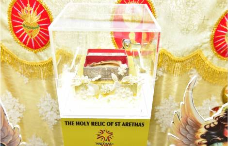 La reliquia di Sant'Areta è stata donata al Vicariato Apostolico dell'Arabia Settentrionale (AVONA), di cui fa parte la parrocchia di Salmiya, dal Patriarca di Costantinopoli Bartolomeo. Domenica 10 dicembre 2023, alla presenza di oltre mille fedeli, (vedi Agenzia Fides 11/12/2023) il vescovo Aldo Berardi, O.SS.T, Vicario Apostolico d’Arabia del Nord, aveva celebrato la festa della dedicazione della Cattedrale di Nostra Signora d’Arabia in Awali, Bahrain, con la consegna delle sacre reliquie tra le quali quella di Sant’Areta.