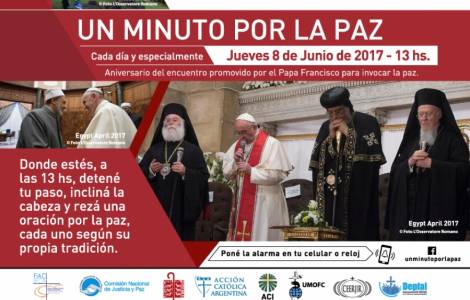 “为世界和平一分钟”很简单,每个人蒙召祈祷、促进世界和平。阿根廷教会此举,旨在纪念教宗方济各于二O一四年六月八日在梵蒂冈会晤以色列总统佩雷斯和巴勒斯坦民族当局主席阿巴斯。