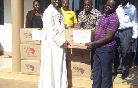 在通布拉教区主教公署举行的为当地中小学校捐书仪式上,库萨拉主教感谢生活在美国的南苏丹天主教徒协会的慷慨捐助。