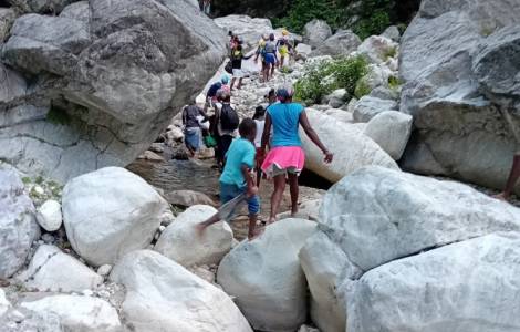波尔辛皮克马卡亚(信仰通讯社)—在海地传教的灵医会传教士,波尔辛皮克马卡亚村本堂司铎马西莫·米拉里奥神父向本社介绍,“我花了三天时间前往圣伯纳德小堂参加堂区主保瞻礼的庆典。这是一次十分艰难、艰辛的旅程,一方面揭示了这个国家目前所面临的艰难道路;另一方面却也再次展现了民众的坚韧和勇气——他们背负重物跋涉于这片交通阻断、地势险峻的荒野”。从波尔辛皮克马卡亚到南米耶尔,先要沿着河床跋涉四个小时,再沿着小径攀登才能达到目的地。