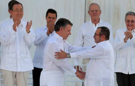 وفي ختام الليتورجيا، أقيم احتفال توقيع اتفاقات السلام. وأثارت إحدى جمل خطاب رودريغو لوندونيو إيتشيبيري – المعروف أيضاً باسم تيموتشينكو – الذي كان لا يزال قبل ساعات زعيم القوات المسلحة الثورية الكولومبية، مفاجأة كبيرة. في الحقيقة، قال: "أطلب السماح من الكولومبيين على كل الألم الذي سببناه. يجب ألا يشك أحد في أننا نسير نحو السياسة من دون سلاح. ونحن نستعد جميعاً لنزع أسلحة الأذهان والقلوب". والآن، لم يعد ينقص سوى إقرار الاتفاقات من خلال استفتاء شعبي من المقرر إجراؤه يوم الأحد المقبل 2 أكتوبر. (وكالة فيدس 27/09/2016)