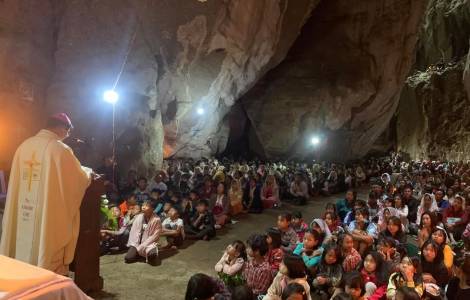 Loikaw (Agencia Fides) - La celebración de la Navidad tuvo lugar este año en un entorno extraordinario para los fieles católicos refugiados en la diócesis de Loikaw, en el este de Myanmar. Reunidos en el refugio de una cueva en la montaña, donde se han asentado para escapar de los bombardeos, los refugiados participaron en una misa presidida por el obispo Celso Ba Shwe. En este singular altar, erigido en las entrañas de la roca, resonaron las palabras de consuelo y esperanza propias del mensaje navideño.