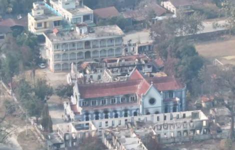 Frente a la catedral, en cambio, se observa el edificio de la antigua casa del clero, incendiado y destruido el pasado 26 de febrero (véase Fides, 17/3/2025). El obispo Gam explica el contexto de estos sucesos: “Desde diciembre del año pasado, la zona donde se encuentra nuestro complejo católico de Banmaw (que incluye la catedral, dos casas del clero, el Centro Pastoral y la residencia) ha sido escenario de enfrentamientos entre el ejército y el KIA. Todo el personal, religiosos y laicos, tuvo que huir. A finales de febrero, los combates llegaron hasta nuestras instalaciones y, el 16 de marzo, la catedral fue incendiada, en vísperas del día de San Patricio”.