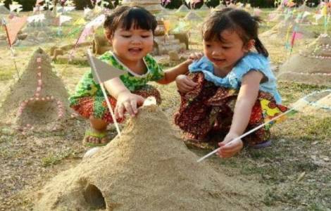 Le missionnaire raconte : « Au cours de cette semaine, la fête la plus importante du pays, se voient diverses traditions significatives dont celle des Cedi (stupa) de sable. Selon l’enseignement bouddhiste, au début de chaque nouvelle année, les personnes sont invitées à ramener au temple la poussière s’étant attachée aux pieds au cours de l’année passée. Alors, enfants, jeunes et adultes se rendent dans les temples avec des petits seaux de sables pour recommencer le cycle du temps. Partout se voient des monceaux de sable avec quelques fleurs ou de petits drapeaux. Désormais, il est devenu également une coutume de construire avec le sable des répliques plus ou moins grandes et solennelles des Cedi célèbres ».