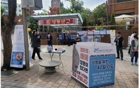 Les catholiques participant aux activités du "Comité pour la vie" ont installé un point de prière et de sensibilisation culturelle près de la cathédrale de Myeongdong. Les membres du comité sont disponibles pour expliquer aux passants le thème du respect de la vie humaine dès la conception, y compris en accompagnant les femmes en difficulté, qui ont des doutes ou envisagent l'avortement, avec une aide psychologique. Dans la rue, les fidèles prennent le temps de réciter le chapelet, en confiant à la Vierge Marie, la Mère céleste, toute action visant à défendre, protéger et promouvoir la vie humaine.
