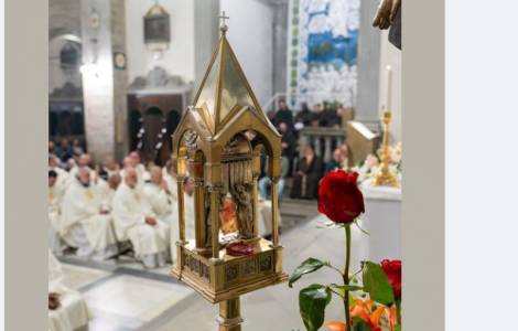 Rome (Agence Fides) - « Après 800 ans, nous ramenons Saint François en Terre Sainte pour essayer d'être, comme lui, capables de franchir les frontières dans un lieu blessé, tout comme, il y a huit siècles, le Poverello s'est rendu en pèlerinage dans les lieux saints à une époque tout aussi difficile, car marquée par les Croisades, avec le désir de construire des ponts et non des murs ». C'est ainsi que Fra' Matteo Brena, Commissaire de Terre Sainte des Frères Mineurs de Toscane et coordinateur du Comité pour le 800ème anniversaire des stigmates de Saint François, annonce que du 30 septembre au 5 octobre, avec 10 autres personnes, frères et laïcs, il portera la relique du sang de Saint François d'Assise en Terre Sainte, alors que la guerre fait rage et que les populations de ces territoires troublés sont dans la souffrance, la peur, le deuil et la précarité.