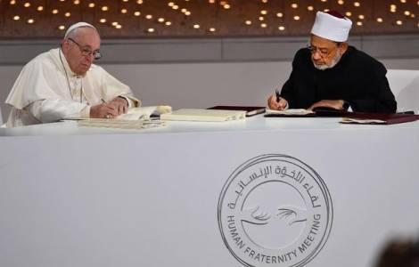 Roma (Agenzia Fides) - Il 4 febbraio 2019, quando il Vescovo di Roma e il Grande Imam di Al Azhar firmarono a Abu Dhabi il Documento sulla Fratellanza umana per la pace universale e la convivenza comune, il loro gesto non annunciato spiazzò molti. Anche la macchina dell’informazione specializzata ebbe bisogno di un po’ di tempo a prendere le misure del documento, e darne conto in maniera appropriata.
