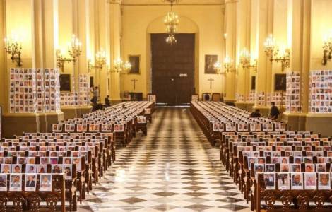利马(信仰通讯社)—Covid-19疫情之际,秘鲁首都利马总主教区于六月十四日在总主教座堂闭门举行了基督徒圣体圣血瞻礼隆重弥撒圣祭,而圣堂长凳,甚至圆柱上贴满了五千名死于Covid-19人士的照片以示哀思和纪念。